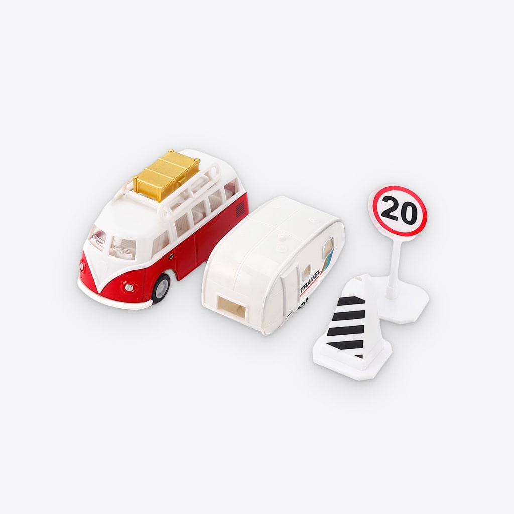 The package includes a recognizable bus we all have seen in the movies, an RV, a traffic cone, and a speed limit sign. The attributes of a real road trip!