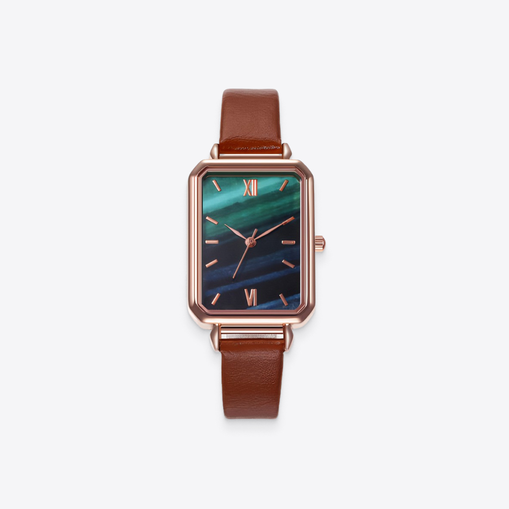 Brown strap tastefully completes the golden case, creating a beautiful tandem. The dial that looks like Northern Lights glues your gaze.