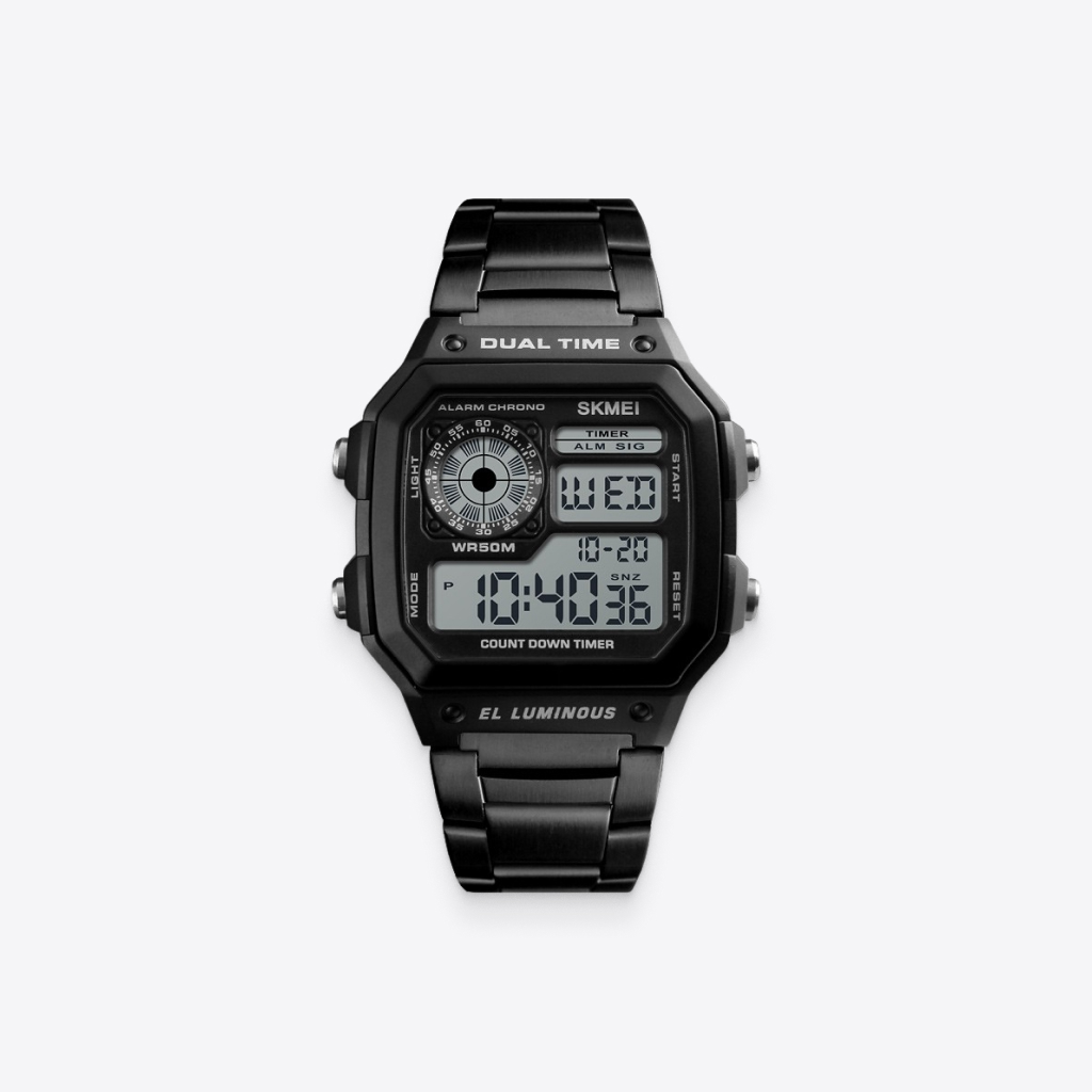 With this watch, you can not only set the time but also, thanks to its multi-functional display, keep track of the day of the week, the date and the month. Additional functions include an alarm clock, an El light, a chronograph, a 12 or 24 hour clock, a countdown feature and dual time.