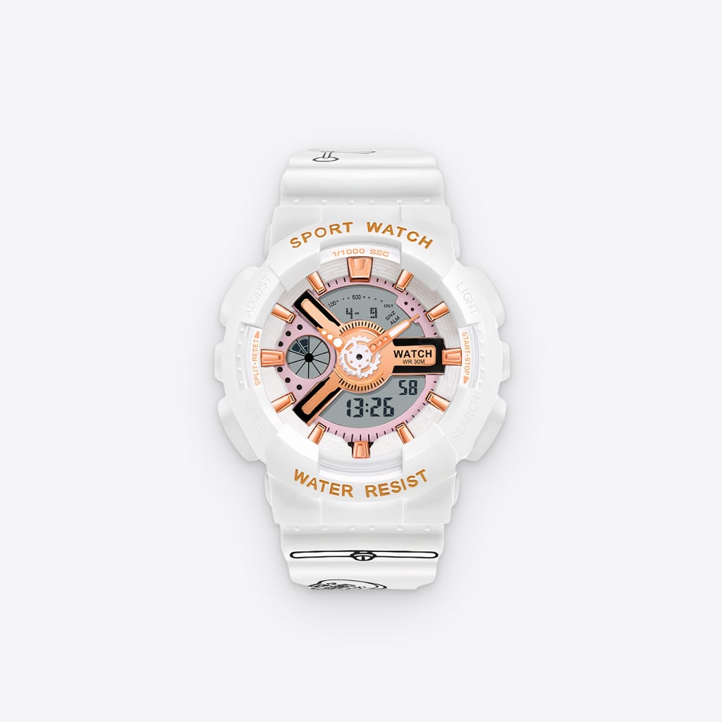 This is a womens white sporty watch that fits your daily needs and outfits with multiple functions such as an alarm, a world timer, and day/date/month features.