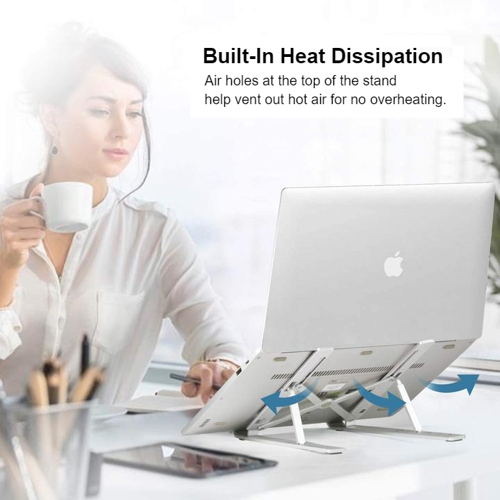 MBuilt-in air vents at the bottom of our Adjustable Aluminum Laptop Stand help ventilate hot air from your laptop or tablet, so you wont have to worry about overheating.