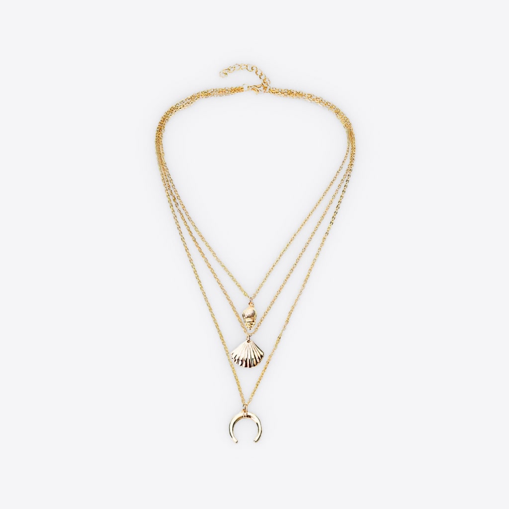 Number of layers: 3. Length: 18 in. + 2.6 in., 20 in. + 2.6 in., 22.2 in. + 2.6 in. Pendants: seashels and moon. Color: gold-toned. Weight: 0.8 oz. Material: alloy.