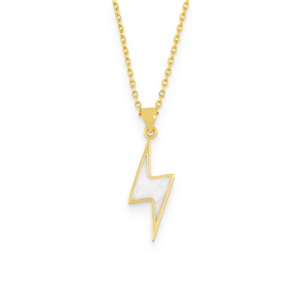 This insanely cute Lightning Pendant Necklace has a lovely gold tone. Length: 17.7 in. + 5 in. Material: brass. Type of chain: cable.