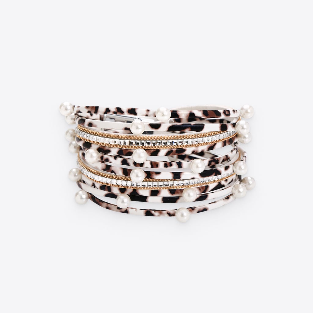 This insanely fashionable Multilayered Leopard Bracelet is made of stainless steel. Its intricately decorated with faux pearls, rhinestones, and thin gold-colored chains, adding a savage touch to your look.