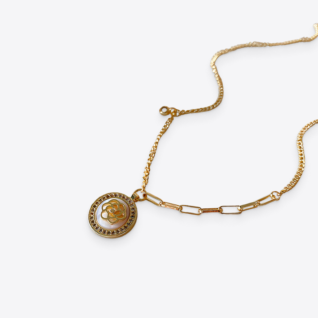 Jewelry material: brass. Shape: a chain with a round rose-shaped pendant. Color: golden and white.