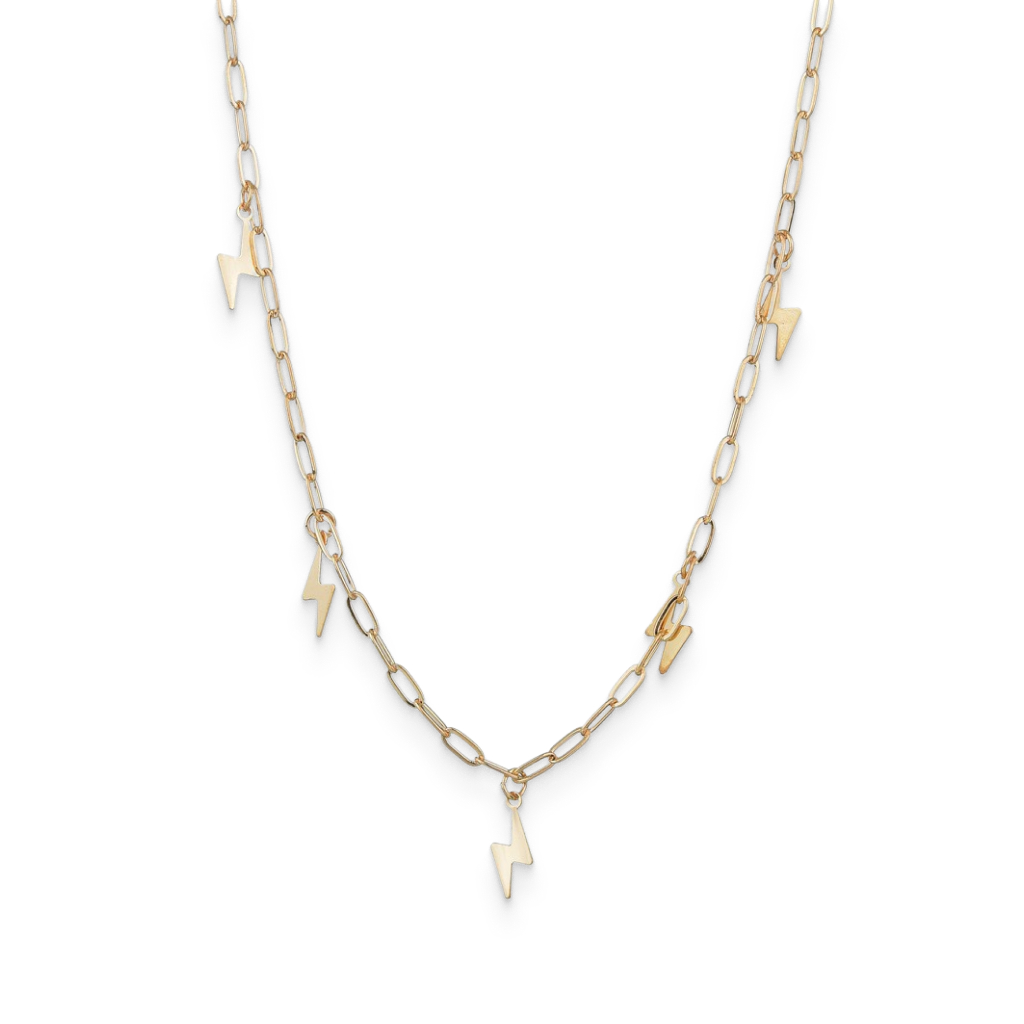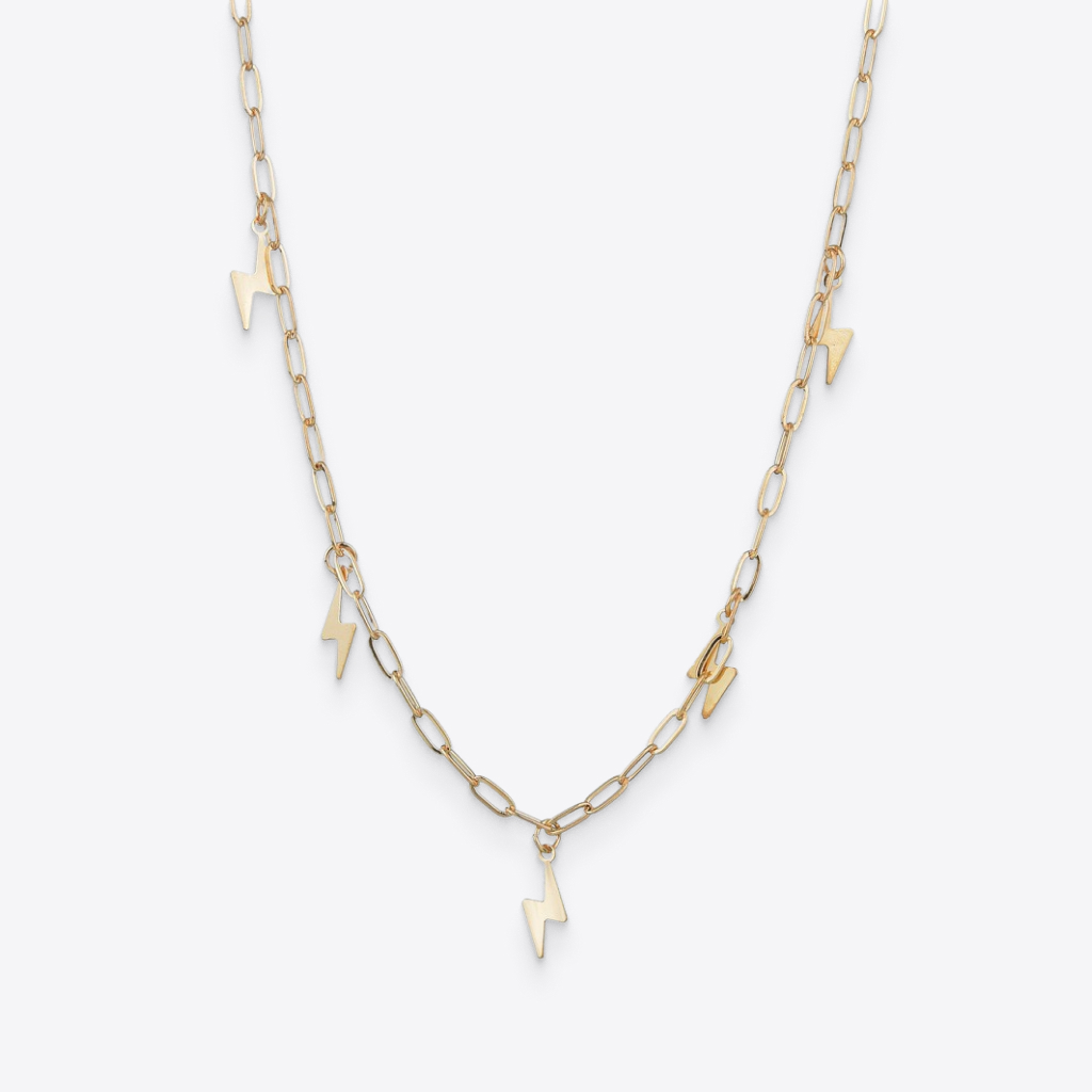 The charming necklaces main materials feature gold plated alloy with gold plated lightning pendants.