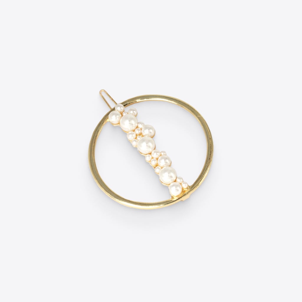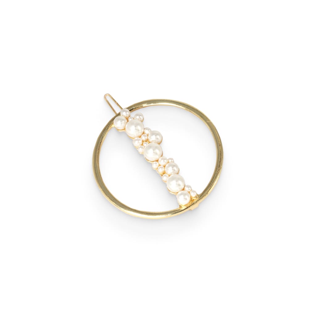 This stunning Faux Pearl Hair Clip has a lovely golden tone and is decorated with faux pearls. Size: 2.6 in.*2.6 in. Weight: 0.5 oz.
