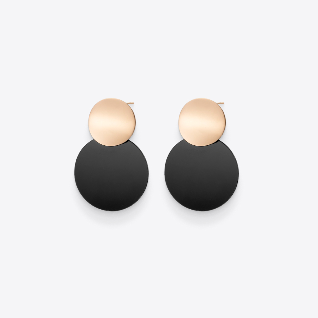 These disc earrings are made of stainless steel. The size of a black circle: 0.8 in. The size of a rose gold-toned circle: 0.4 in. The size of the black-colored circle: 0.8 in.