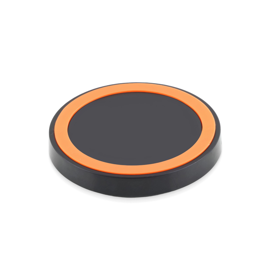 This charger is so petite: 2.75 inches wide and super thin - perfect for any desk. The orange rim is supposed to make it stand out and be noticeable. The indicator glows blue when charging is in progress, red when its not.