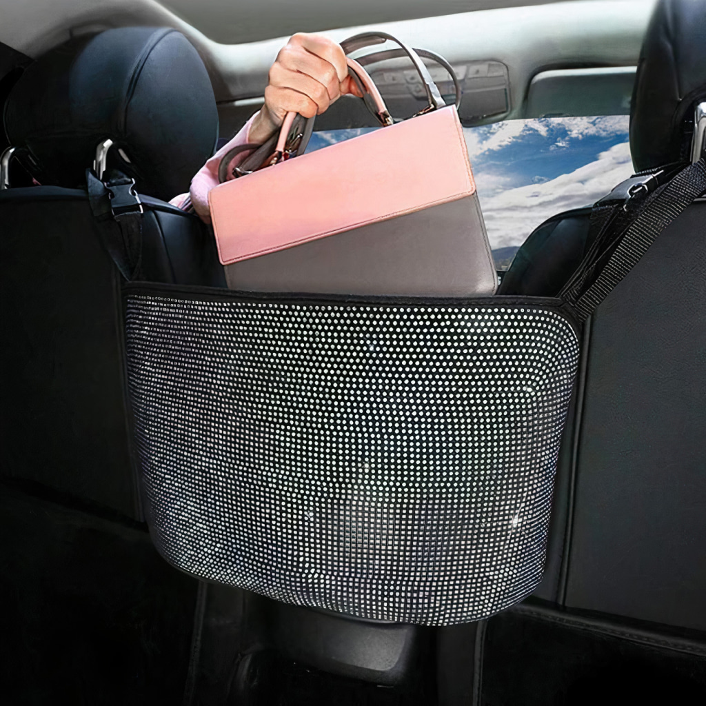 Reduce the risk of accidents and stop distracted driving by implementing this fuss-free Rhinestone Backseat Handbag Holder for a glamorous touch that provides essential function.