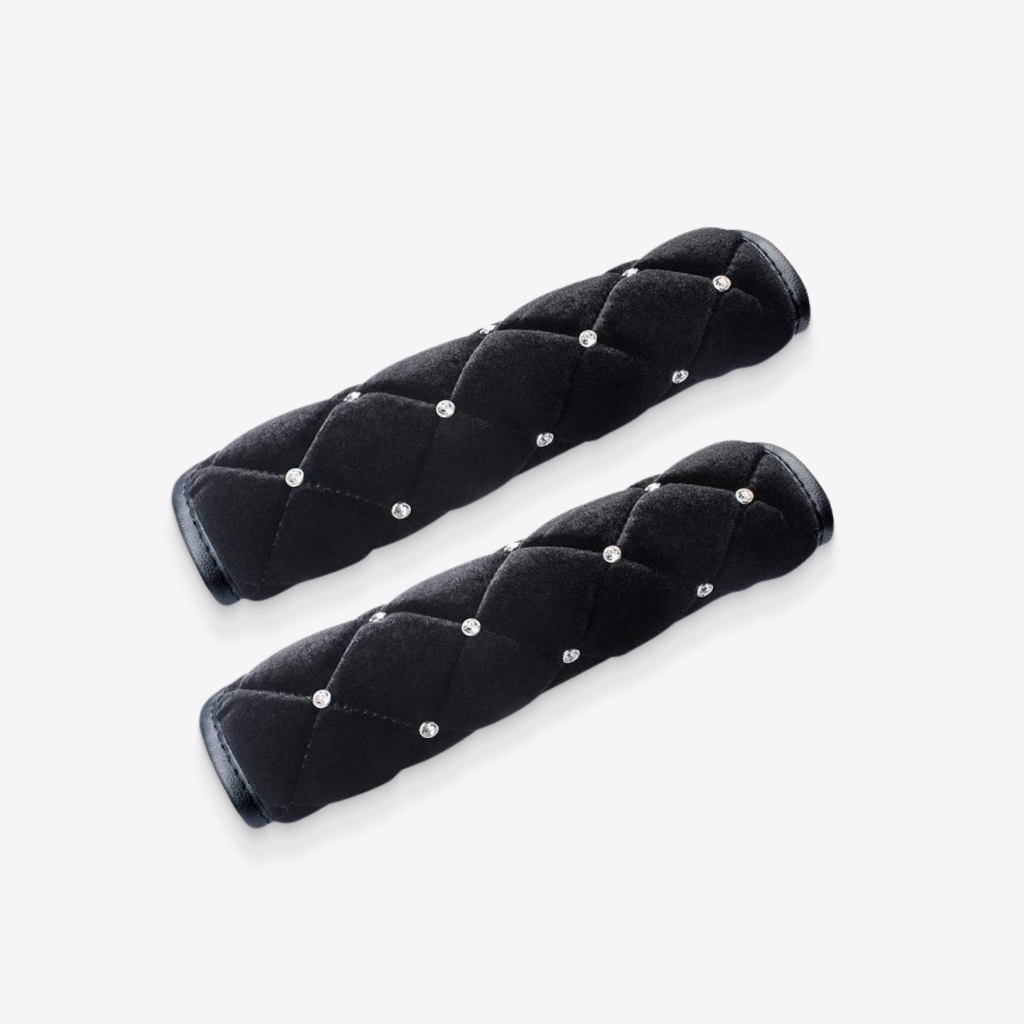 Introduce texture and softness into your vehicles interior and ride quality with these cant-be-missed Black Soft Patterned Seat Belt Strap Covers With Bling Detail. Let our rhinestone details catch the light while soft padding helps reduce seatbelt pressure and discomfort.